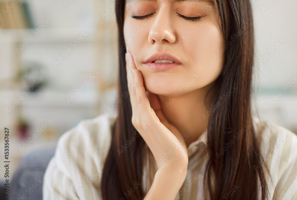 Papier peint Closeup portrait of young unhappy upset woman sitting on the sofa in the living room at home suffering from toothache
