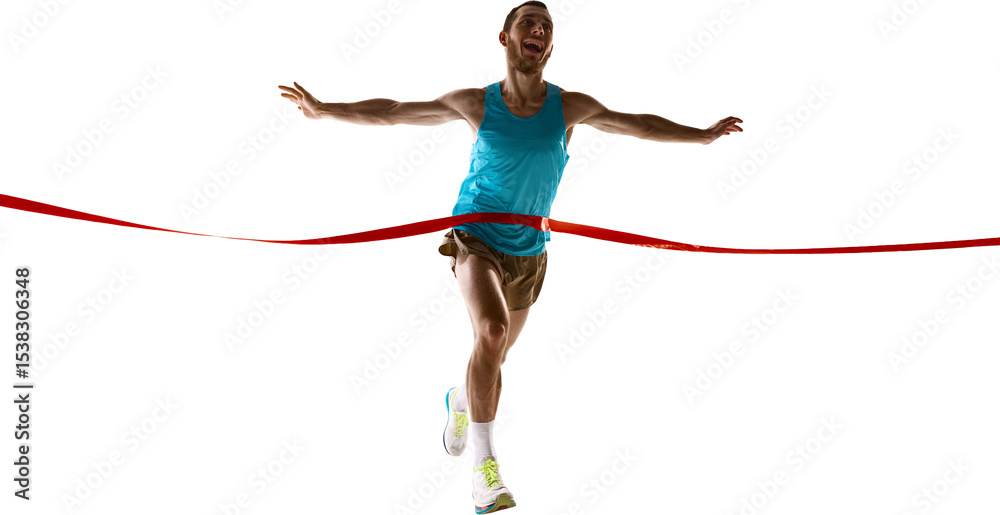 Papier peint Athletic male crosses red ribbon at finish line with open arms, smiling in celebration of achievement, showing energy, speed, and determination on transparent background
