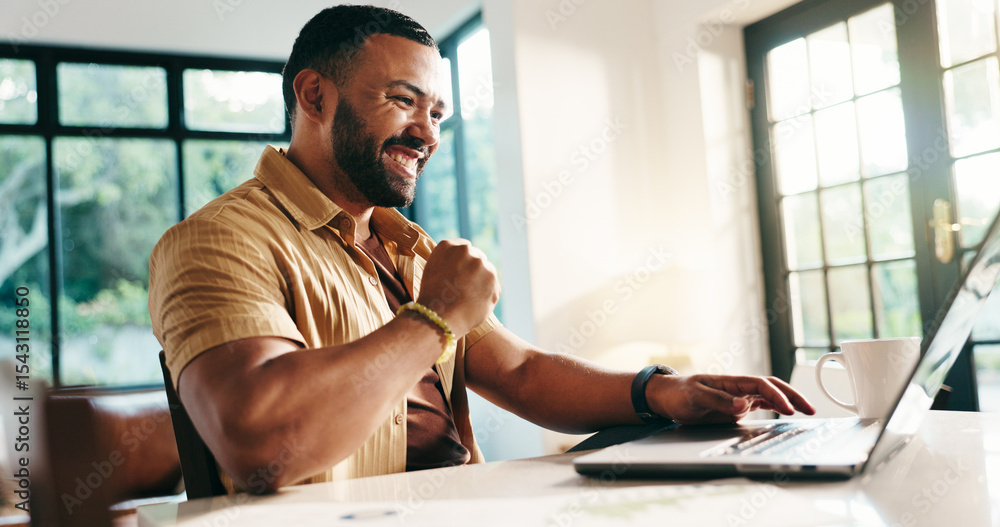 Papier peint Excited, man and success with laptop at house for good news, loan approval and celebration