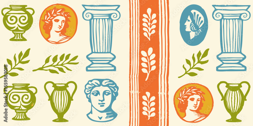 Papier peint Ancient Greece Inspired Pattern with Columns Vases and Laurel Wreaths