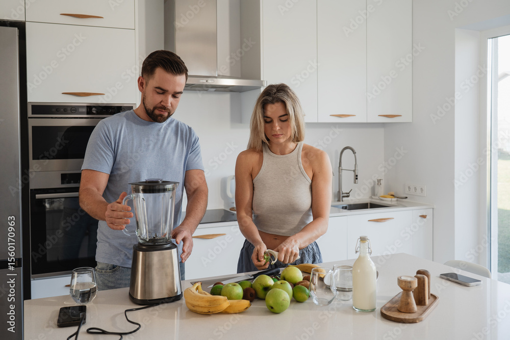 Papier peint Couple Preparing Healthy Smoothie Together in Bright Modern Kitchen