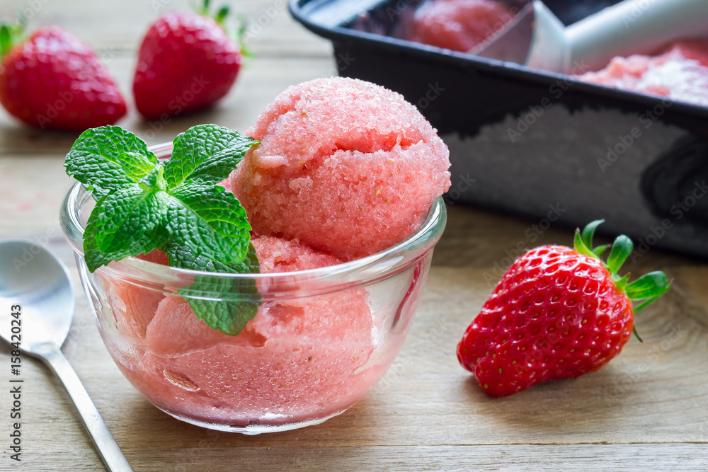 Papier peint Homemade strawberry sorbet in glass on a wooden table