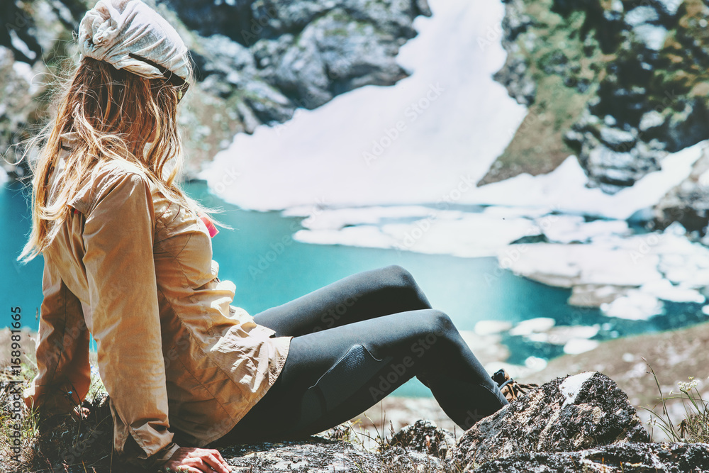 Papier peint Hiker woman relaxing at blue lake in mountains Travel Lifestyle wanderlust concept summer vacations outdoor harmony with nature