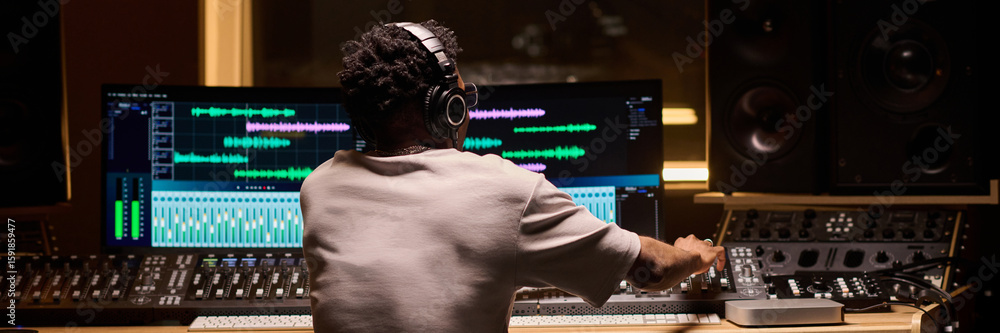 Papier peint Black man young adult sitting at mixing console operating audio equipment in pro