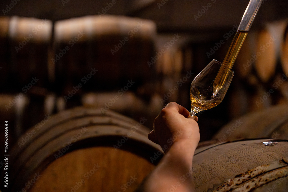 Papier peint Gros plan sur les mains d’un homme prélevant du champagne avec une pipette dans un tonneau en cave, pour le déguster dans un verre