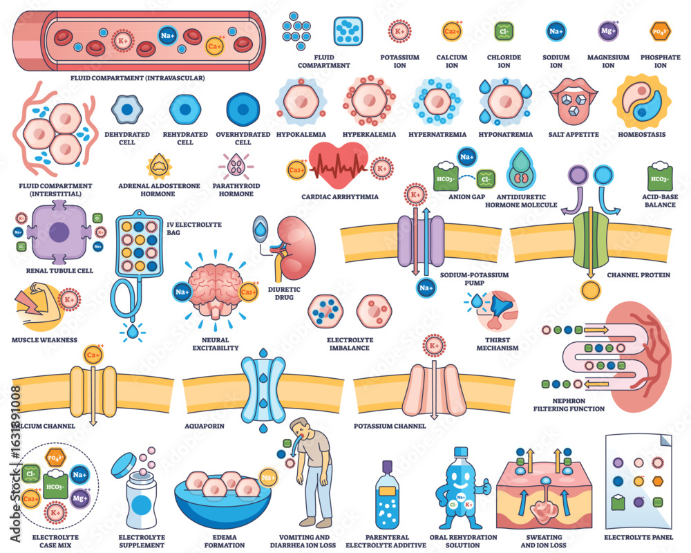 Papier peint Electrolyte balance is shown with ions, cells, and kidney function diagrams, illustrating fluid compartments and imbalances