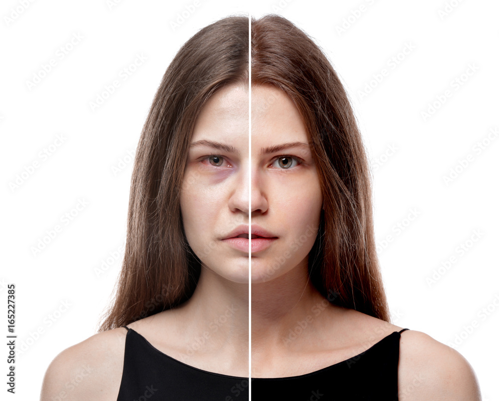 Papier peint Young woman before and after exhaustion caused by sleep deprivation on white bac