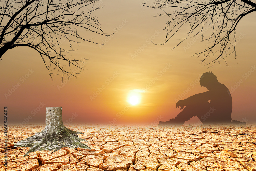 Papier peint Solitude and Despair: A solitary figure is consumed by shadows as a dramatic sunset paints the barren landscape, symbolizing environmental devastation