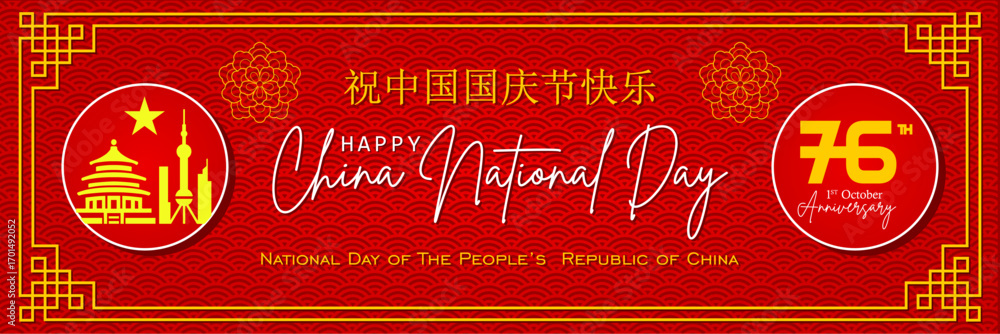 Papier peint China's National Day background template with the number 76, the Chinese symbol logo, and clouds on a dark red background