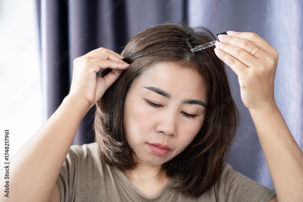 Papier peint Asian woman applying serum on head to treat bald spots, hair loss, and dry scalp