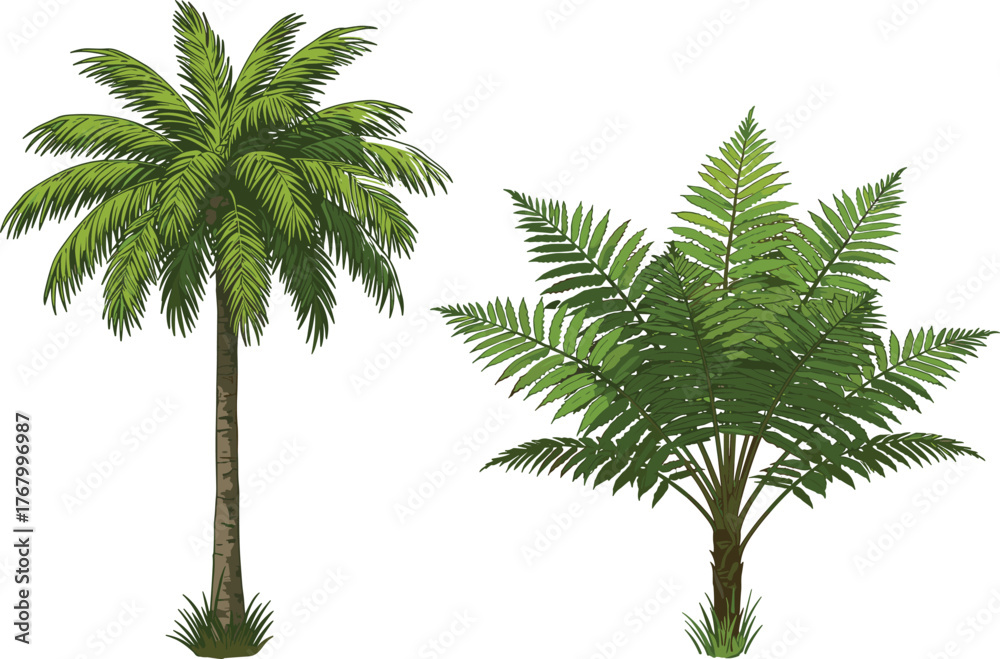 Papier peint Vector illustration of tropical palm tree with long fronds beside lush bushy tre