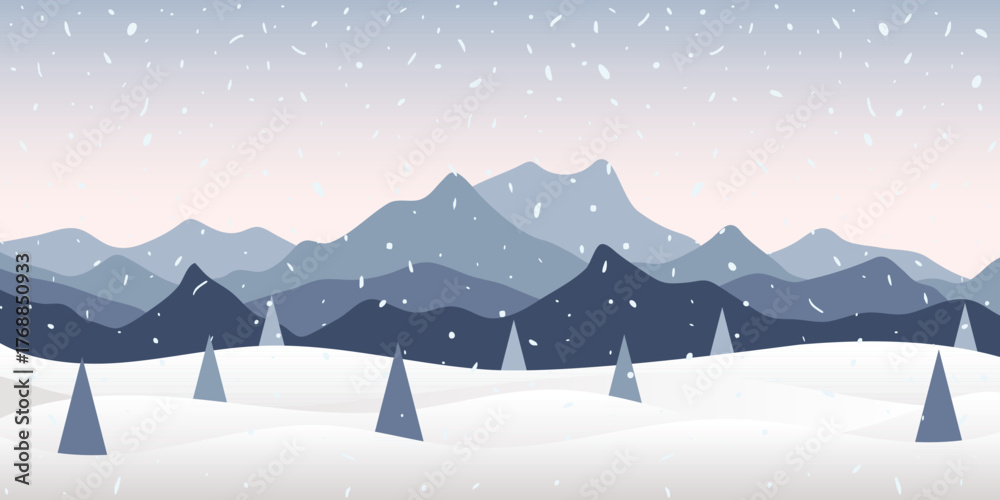 Papier peint Minimalistic winter landscape, snowy peaks and snowdrifts and snowfall, cartoon