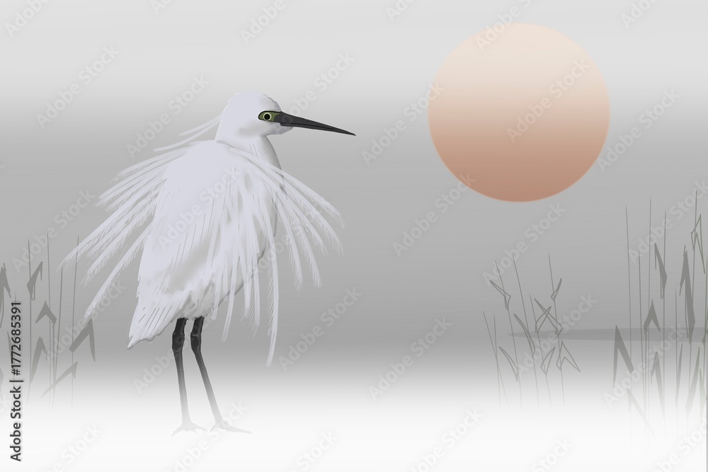 Papier peint The little egret (Egretta garzetta) and morning sun on the lake.