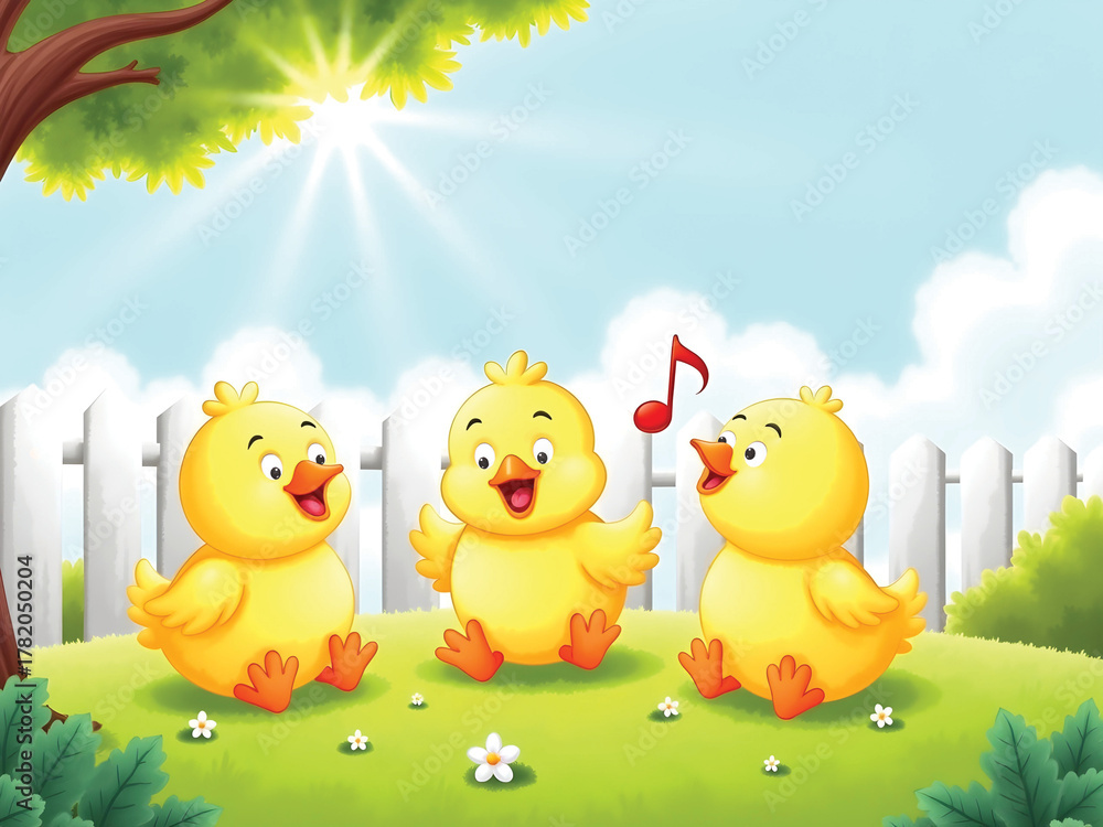 Papier peint Three Little Chicks Chirping Happily in Garden