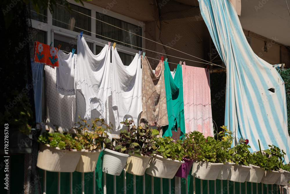 Papier peint Laundry hanging on a line above flower boxes on a sunny balcony in Istanbul, Tur