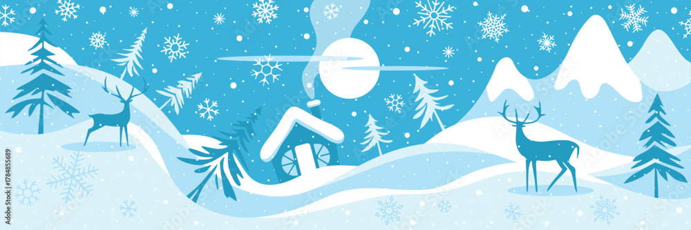 Papier peint Winter cartoon, vector illustration, stylized winter landscape, snowfall and sun