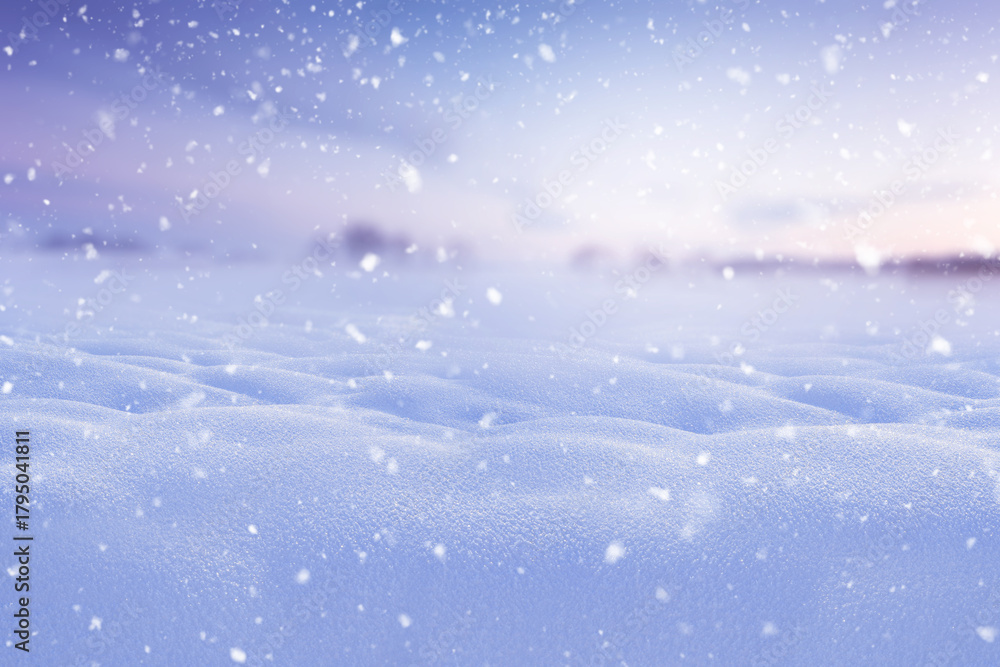Papier peint serene winter landscape with soft snowdrifts and falling snowflakes under a pastel sky, creating a peaceful and dreamy seasonal atmosphere