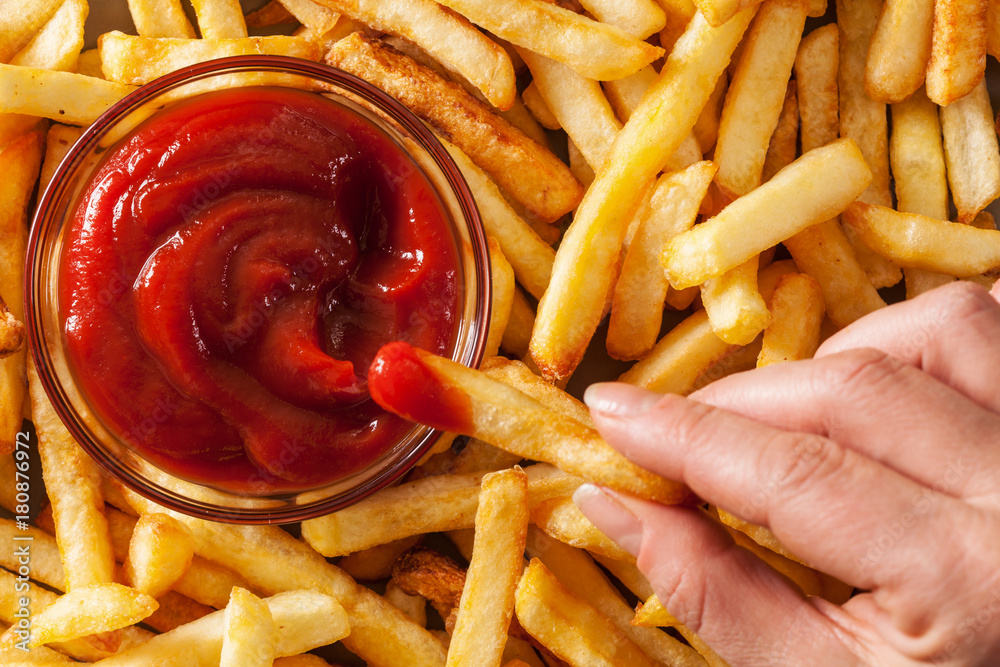 Hand dipping french fries in tomato sauce or ketchup