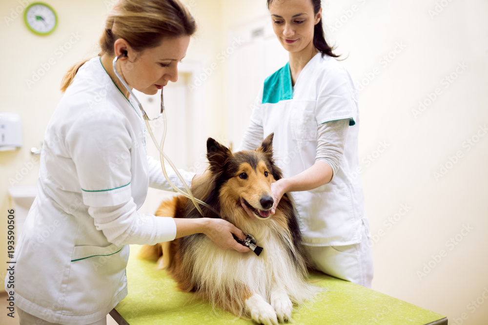 Papier peint Group of veterinarian examinig dog at clinic