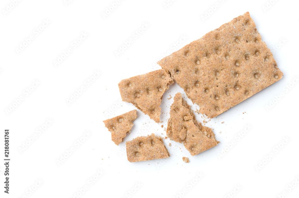 Papier peint Crunchy crispbread with crumbs on white background.