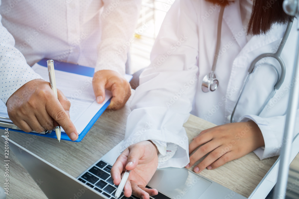 Papier peint Healthcare medical concept, Expert Team of Doctors working information for examining Medicals Exams about Patient database through laptop computer, tablet and have Stethoscope on hospital office