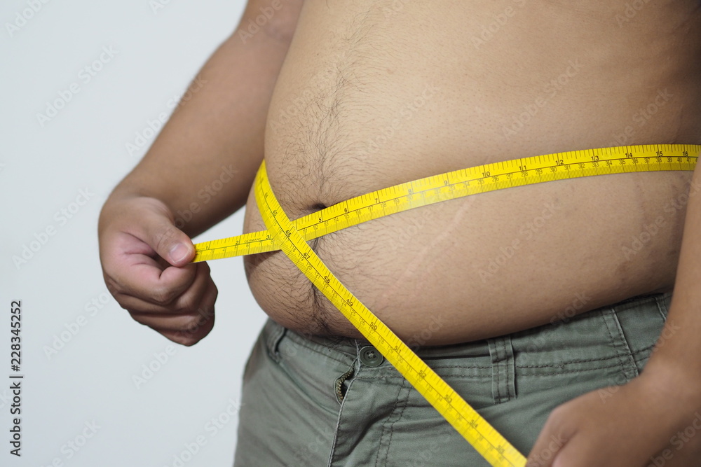 Papier peint Fat man holding a Plastic tape measure for Calculating body fat.