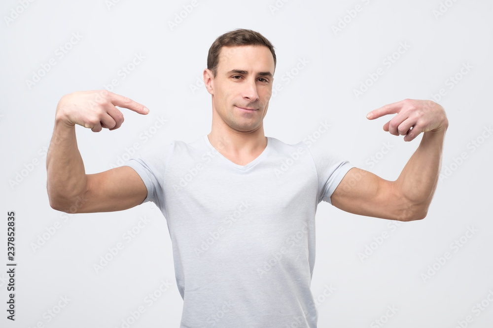 Papier peint Italian man in white t-shirt, standing, pointing himself and looking with serious egoist face