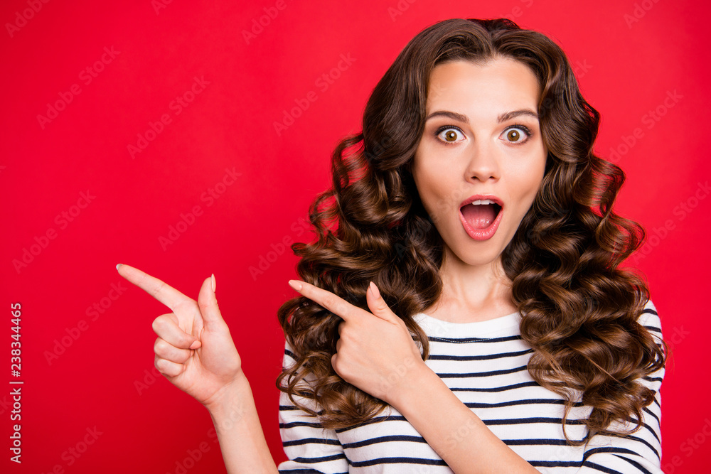 Papier peint Close up photo of attractive beautiful she her lady fingers up to empty space wo