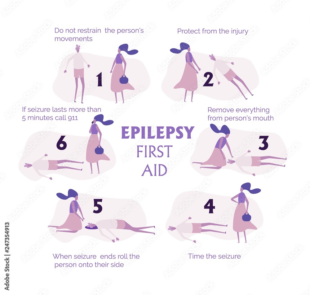 Set of epilepsy seizures first aid situation, with text. Fine for medical infobrochures public sites about epilepsy and medical checks, banners for sites about epilepsy.