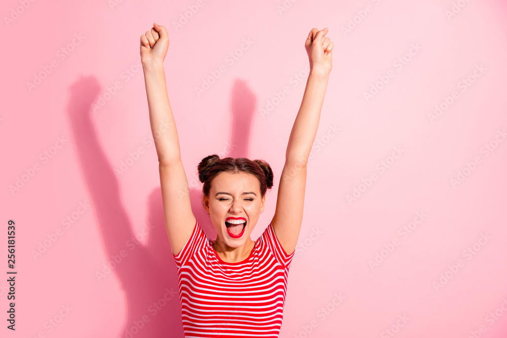 Portrait of her she nice-looking cute charming attractive adorable fascinating lovely cheerful cheery girl wearing striped t-shirt raising hands up isolated over pink pastel background