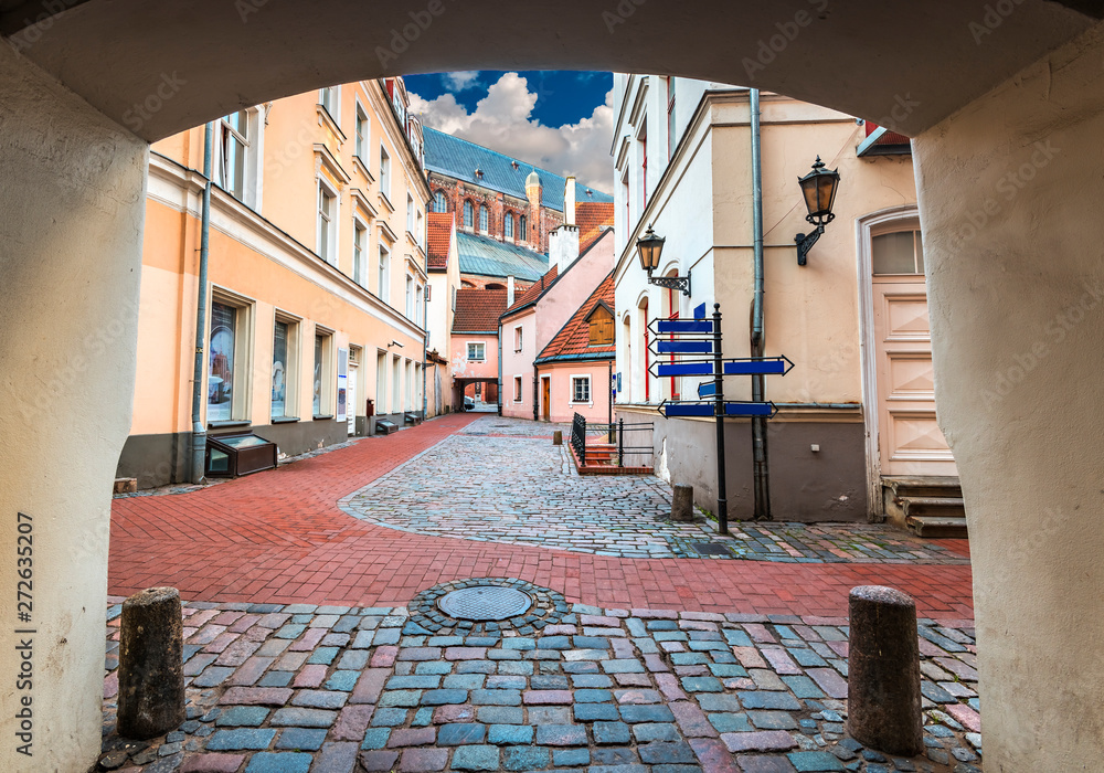 Papier peint Medieval convent yard and spire of St Peter church in old Riga-capital of Latvia