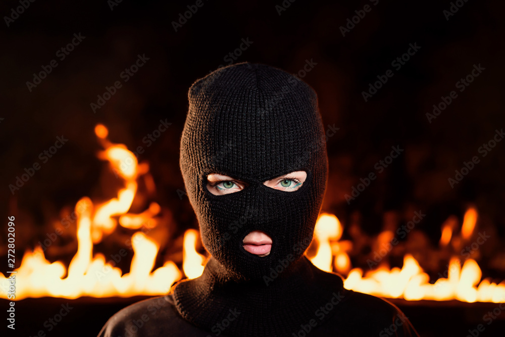 Portrait of young woman in black balaclava against backdrop of a blazing night fire. Concept of mass rallies and riots