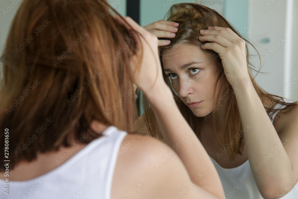 Papier peint Portrait of a beautiful young woman examining her scalp and hair in front of the