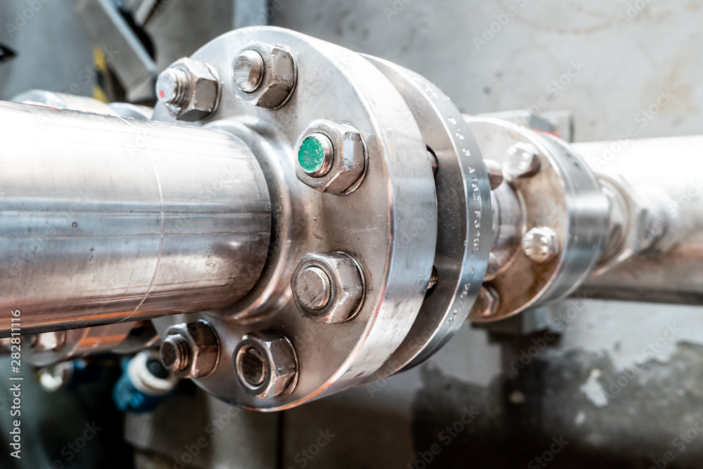 Papier peint close-up view of the flange with bolts of a heavy metal joint on a pipe that tra