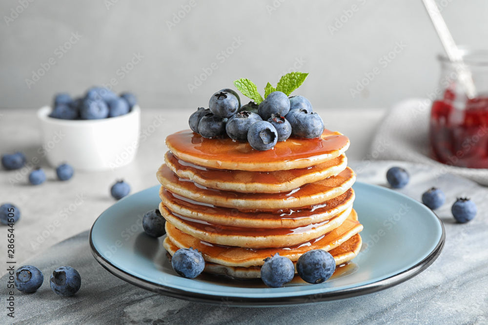 Plate of delicious pancakes with fresh blueberries and syrup on grey table against light background