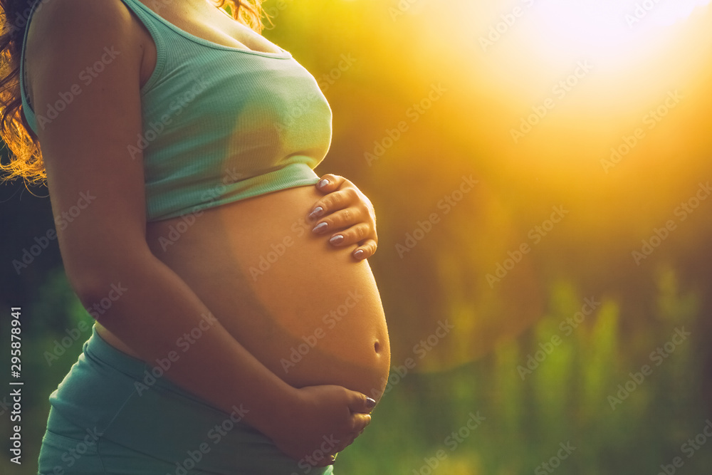 Adult pregnant woman on against the backdrop of the sunset in the park. 9 months of pregnancy and childbirth.