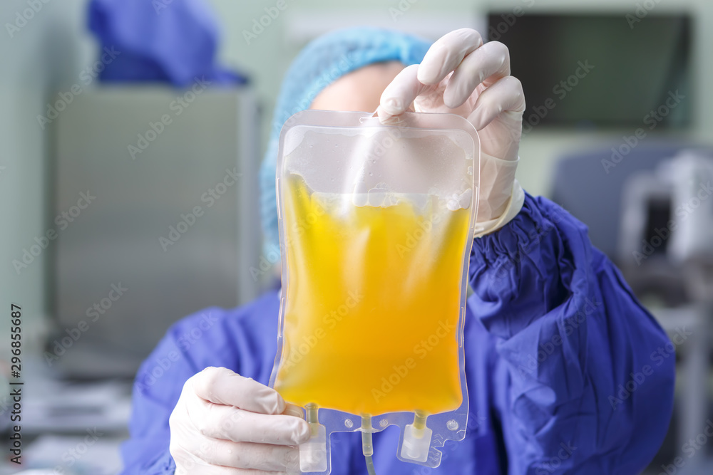 Papier peint Hands of a medical worker holding a bag of donated blood plasma