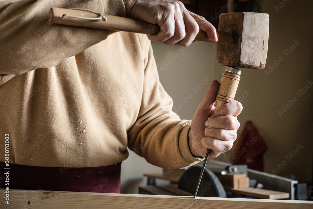 Papier peint Carpenter working with a wooden hammer and a gouge