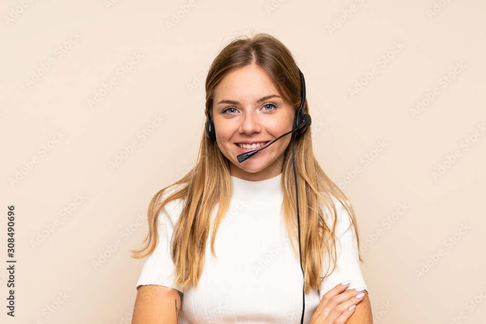 Papier peint Young blonde woman over isolated background working with headset