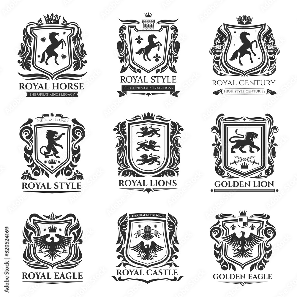 Papier peint Heraldic shields, Medieval animals, Pegasus horse and royal floral emblems