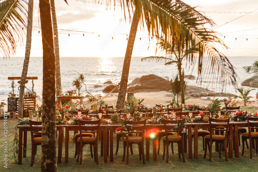 Papier peint Wooden tables for wedding dinner decorated with tropical flowers, pineapples, coconuts and glass lamps