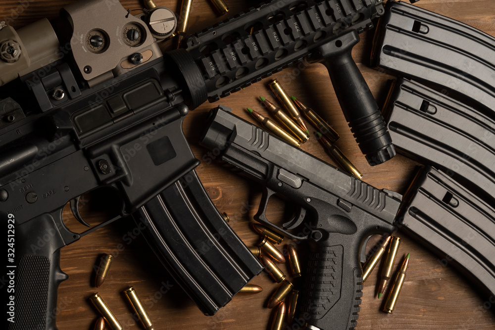 Papier peint m4 rifle with optical sight, hand gun, ammunition and cartriges