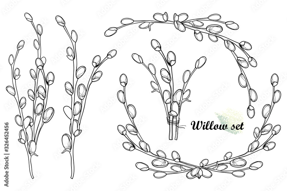 Papier peint Set with outline Willow twigs and bunch in black isolated on white background
