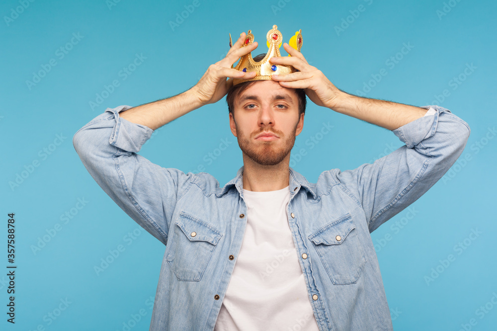 Papier peint I'm ceo! Portrait of worker man wearing golden crown, imagining promotion at work to position of top manager or boss, looking with arrogance, privileged status