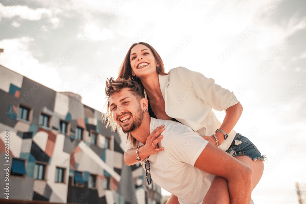Papier peint Ragazza bella e attraente sorride giocando sulle spalle del suo uomo mentre sono