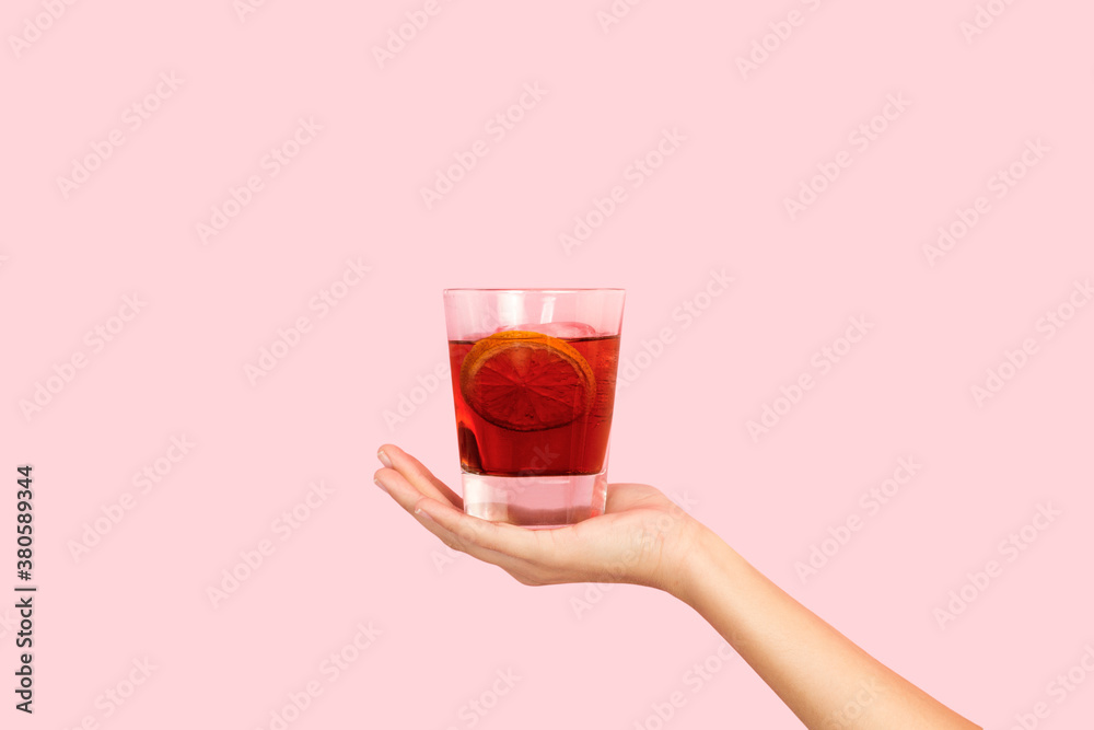 Papier peint Mano femenina sosteniendo un vaso con cocktail sobrte un fondo rosa pastel liso y aislado