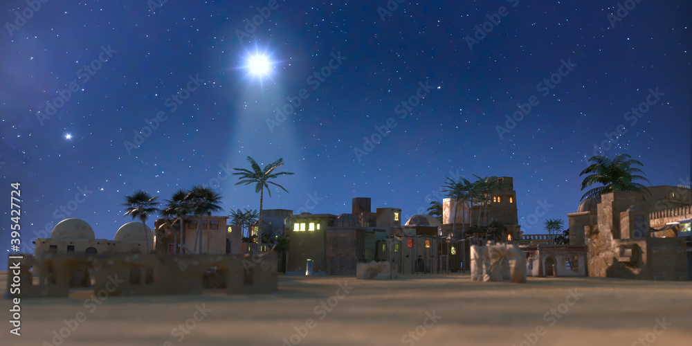 Papier peint The star shines over the manger of christmas of Jesus Christ, 3d render
