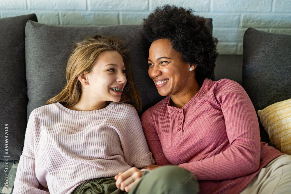Papier peint Loving african american foster care parent single mother embrace teen daughter