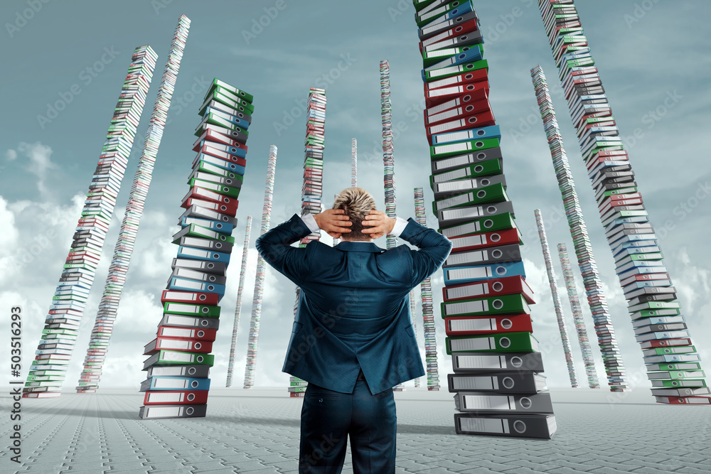 Papier peint An unhappy office worker, a businessman, looks at the towers from many folders with documents
