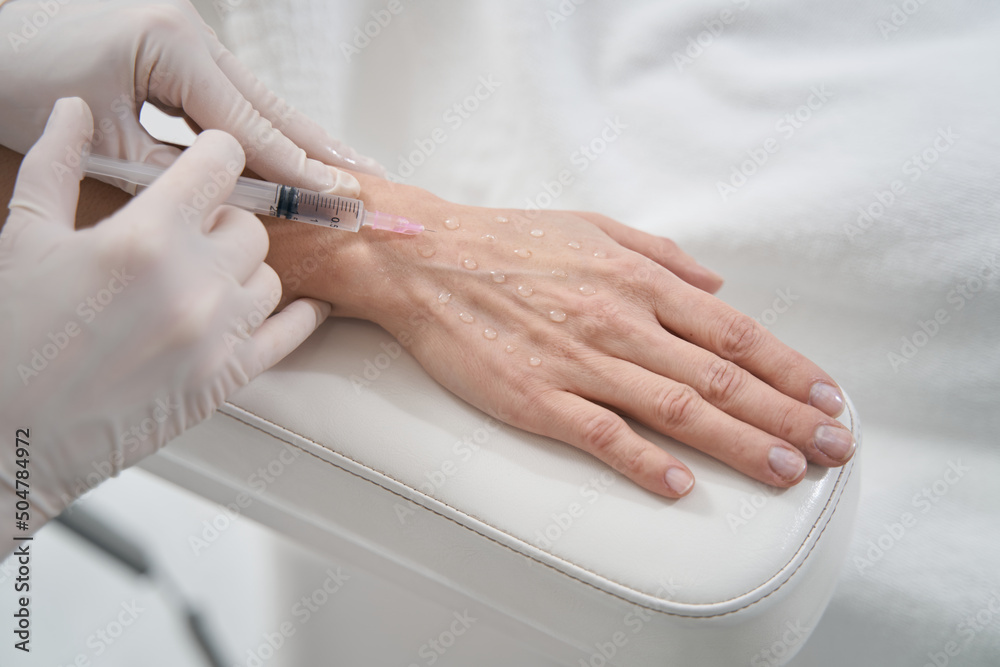 Papier peint Woman receiving hand rejuvenation injection in beauty salon